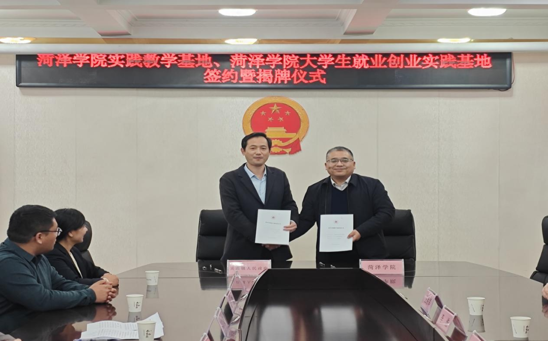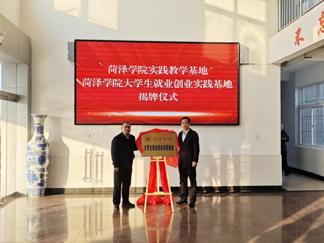在现场嘉宾的见证下,李浩与郜英豪共同签署合作协议,并为“菏泽学院实践教学基地”“菏泽学院大学生就业创业实践基地”揭牌。